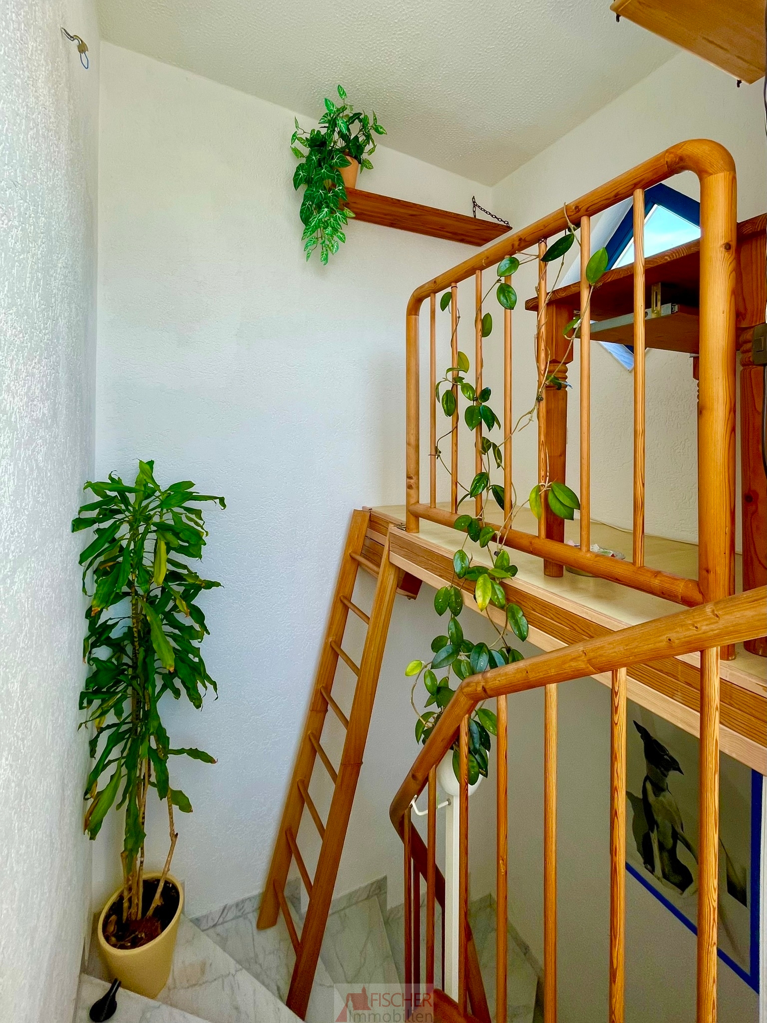 Der Aufgang zur Dachterrasse ist mit marmorierten Bodenfliesen versehen. Das Treppengeländer und der Handlauf bestehen aus Holz und runden das elegante Gesamtbild ab.