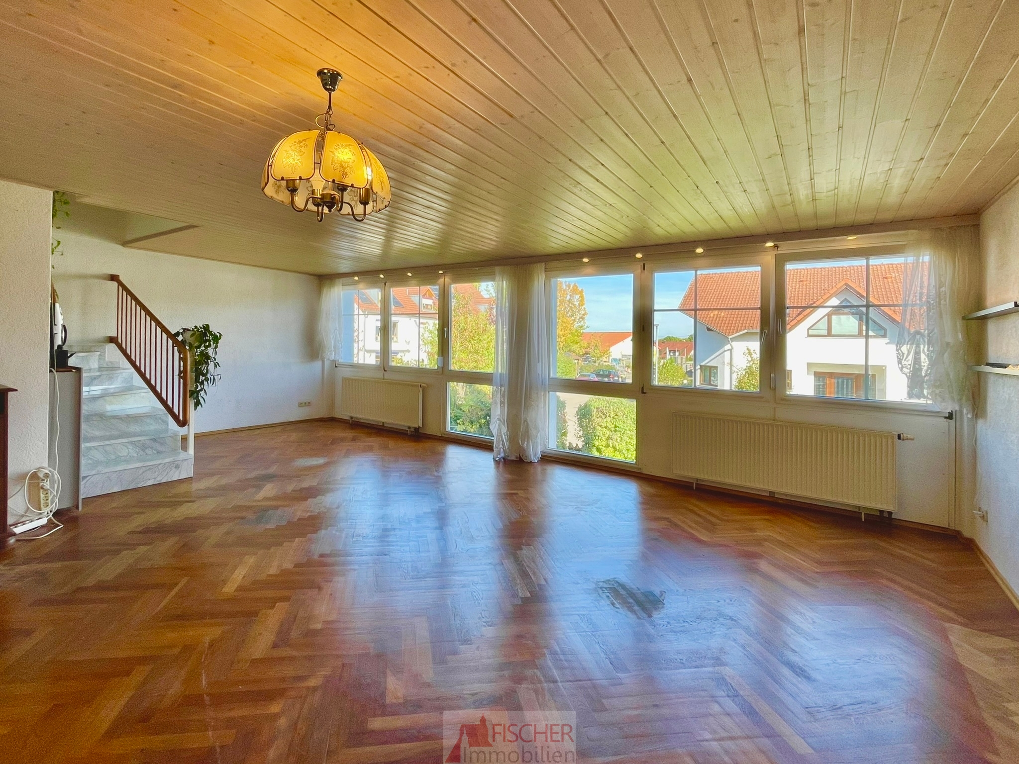 Der großzügige Wohn- und Essbereich ist mit Echtholzparkett im Fischgratmuster ausgestattet, das dem Raum eine besondere Wärme und Stil verleiht.