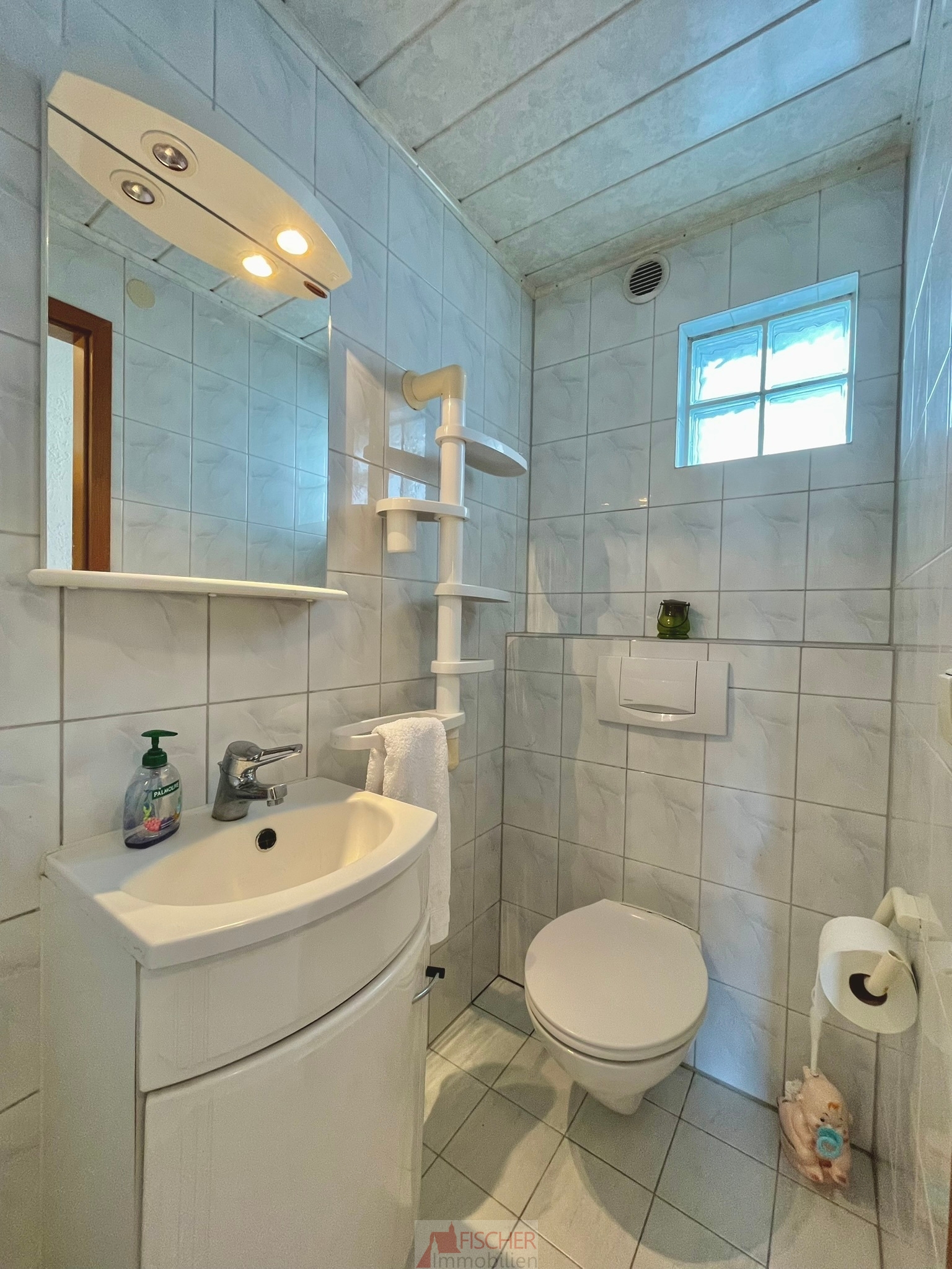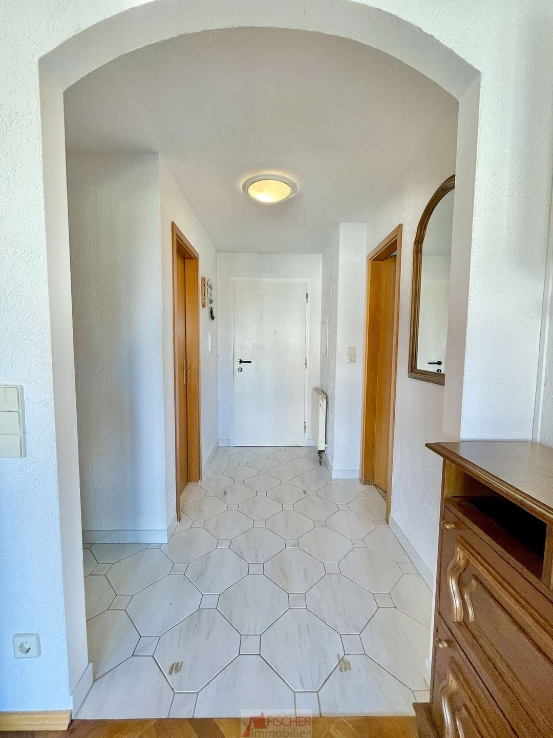 Im Flur sind pflegeleichte, weiße Fliesen verlegt, die den Raum hell und freundlich wirken lassen.