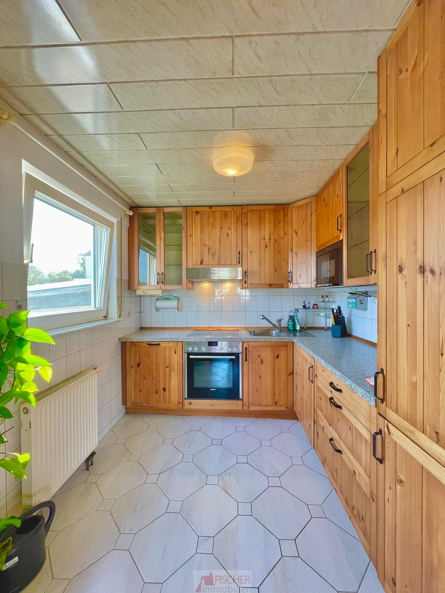 Die Küche ist mit weißen Bodenfliesen versehen und besticht durch rustikal-moderne Küchenmöbel mit Echtholzdekor an den Fronten. Die Kombination aus traditionellem Charme und modernem Design schafft eine einladende Atmosphäre.