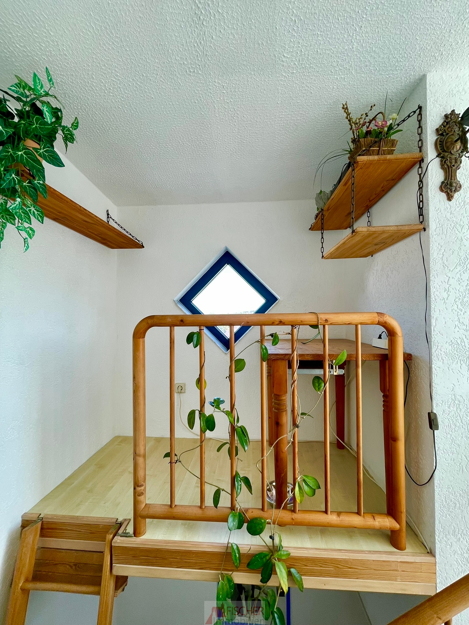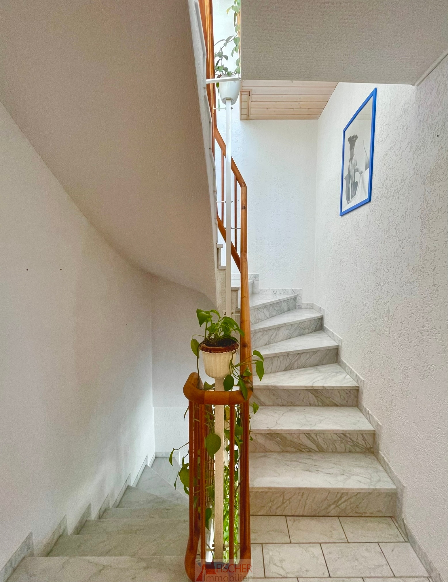 Der Aufgang zur Dachterrasse ist mit marmorierten Bodenfliesen versehen. Das Treppengeländer und der Handlauf bestehen aus Holz und runden das elegante Gesamtbild ab.