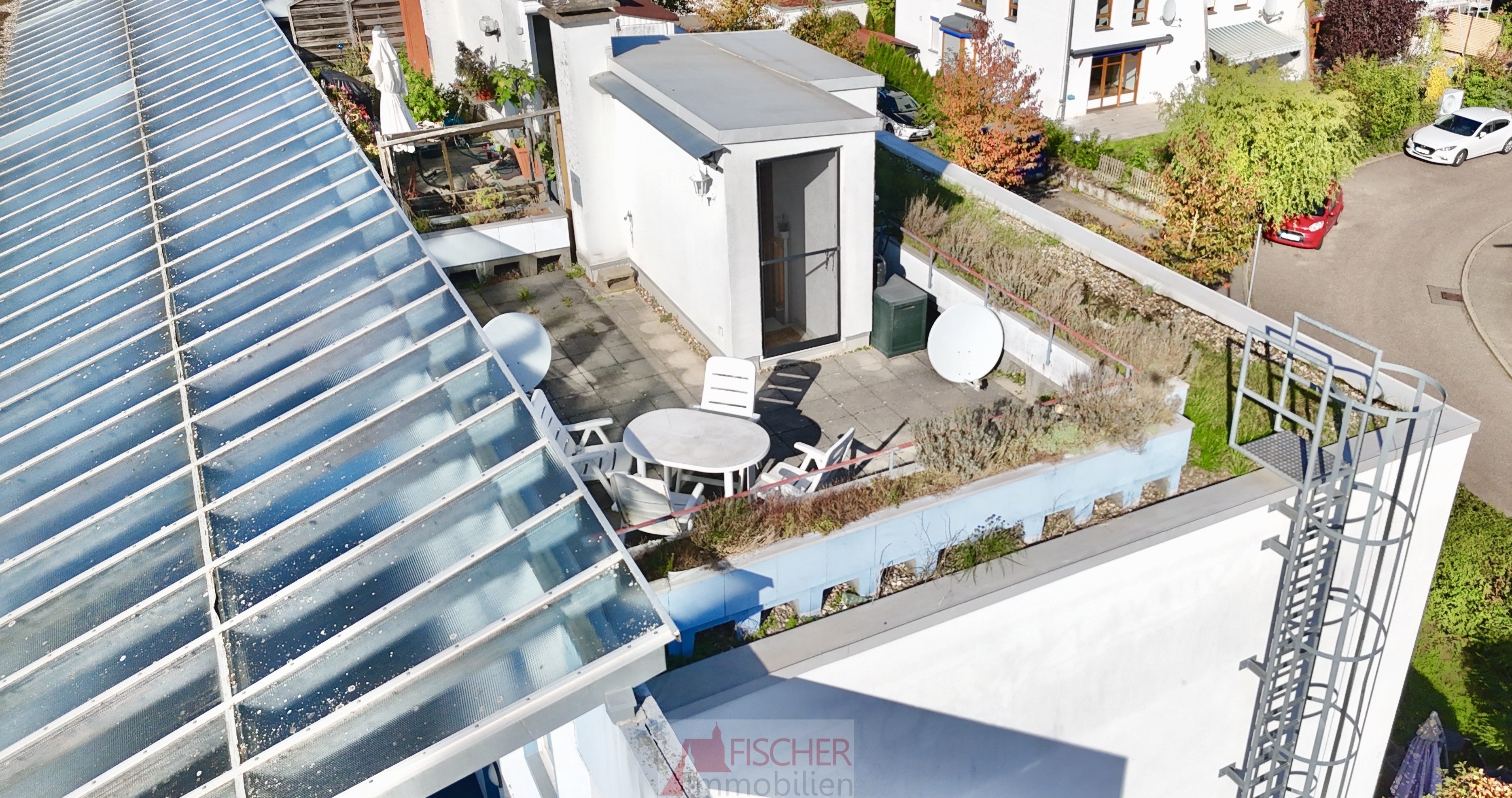 Das Highlight der Wohnung ist zweifelsohne die Dachterrasse. Hier können Sie bei schönem Wetter entspannen, den Tag genießen und den herrlichen Ausblick auf die Umgebung bei einem Glas Wein oder einem guten Buch auskosten.