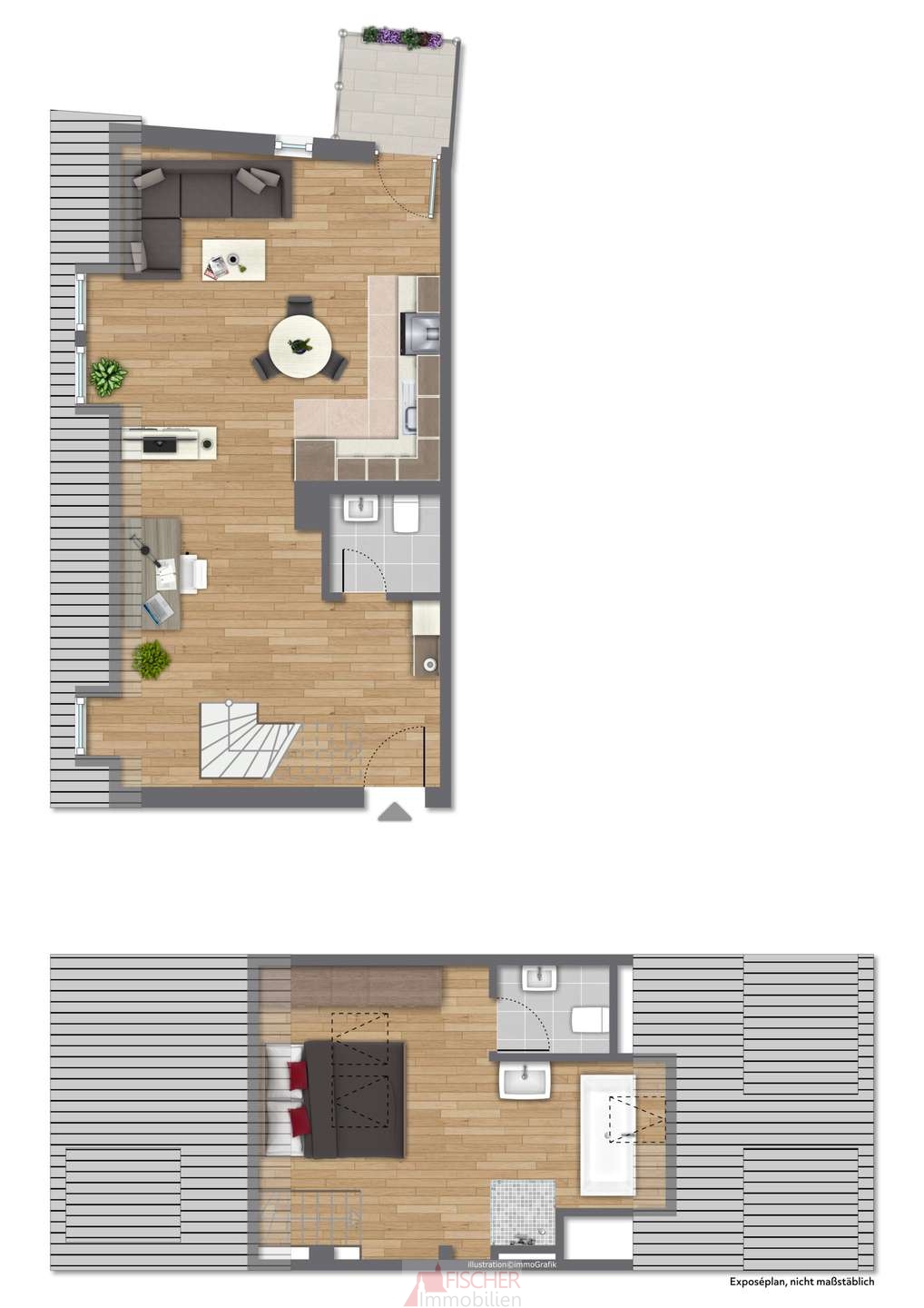 Die offene Küche und das geschmackvoll gestaltete Bad setzen mit großformatigen, grauen Fliesen klare, moderne Akzente. Hochwertige Sanitärausstattung unterstreicht den hohen Anspruch an Qualität und Ästhetik.